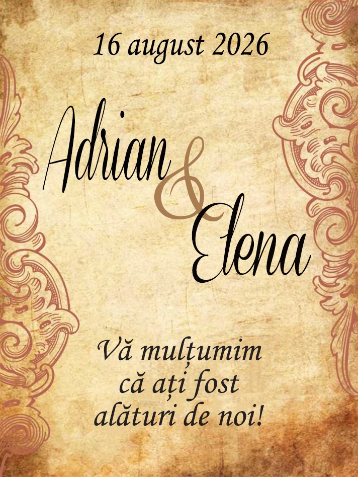 Dacă aţi optat pentru meniul 3 (complet) din oferta noastră, atunci aveţi şi etichetele autoadezive incluse. Acestea se personalizează cu numele mirilor şi data nunţii. Sunt disponibile 3 dimensiuni, în funcţie de sticla pe care se aplică.