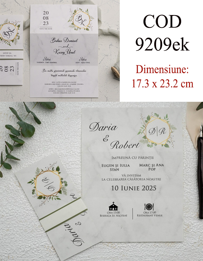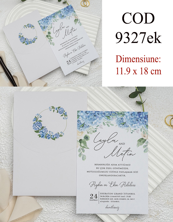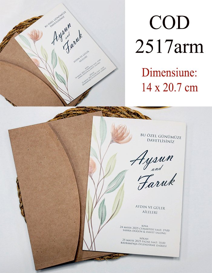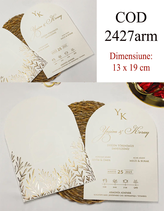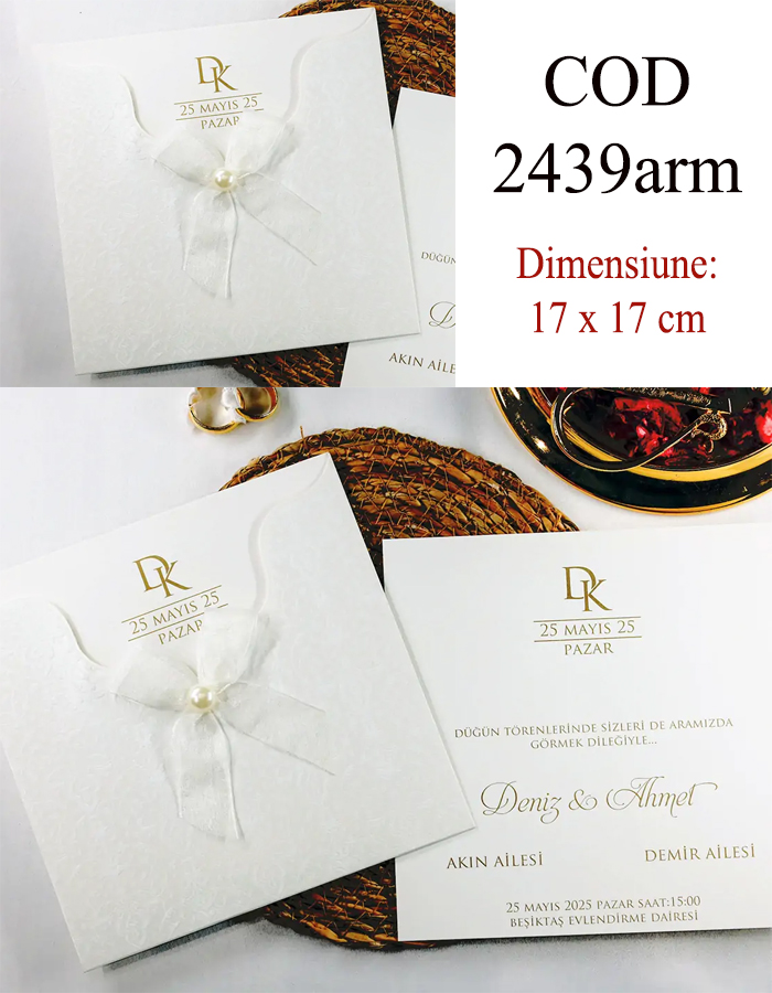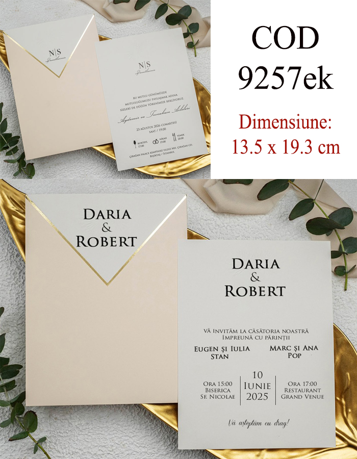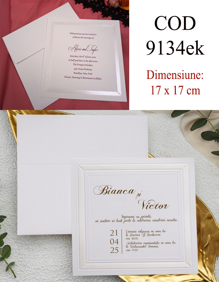 Invitaţiile sunt cum apar în poza de prezentare, dacă nu apare şi plicul în poză, atunci modelul respectiv nu are plic. Dimensiunile sunt afişate pentru a vă face o idee despre mărimea invitaţiei. Culoarea textului care va apărea tipărit pe invitaţii este negru. Fontul folosit este unul modern, elegant, cu diacritice şi este diferit de cel care apare în pozele de prezentare a modelelor de mai jos.