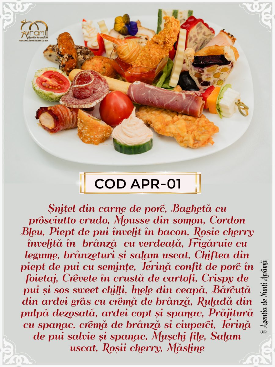 Ne rezervăm dreptul ca, în anumite perioade ale anului când din cauza unor factori externi (probleme de aprovizionare sau păstrare), să înlocuim unele produse (maxim 2-3 produse) din componența aperitivului rece.